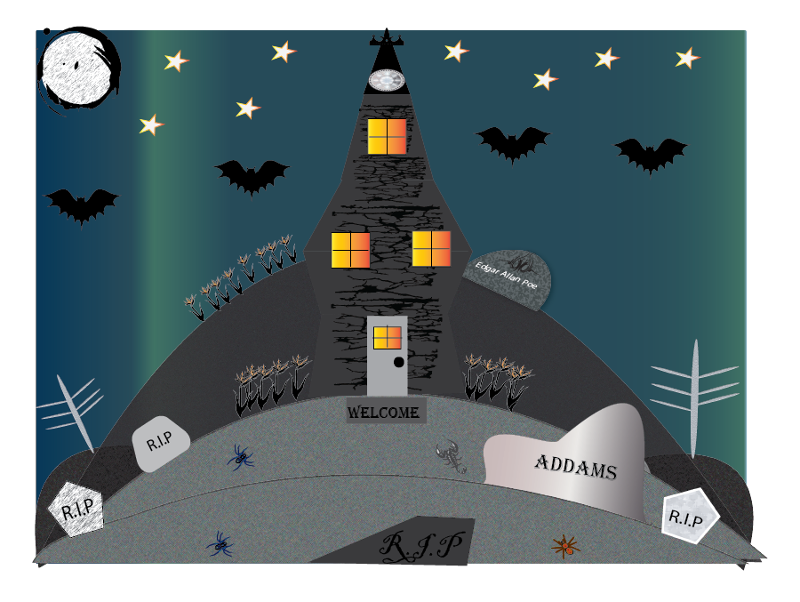 For my project, I wanted to do something a little spooky. I have always loved the Addams family so I decided to create a small graveyard with a house in the back. This is the house of one of the Addams family cousins. I added some bats and spiders along with a scorpion. There are some trees in the back and a full moon in the night sky. I made different-sized hills to make it look like the house is behind the graveyard. This was an interesting project learning to create using shapes.